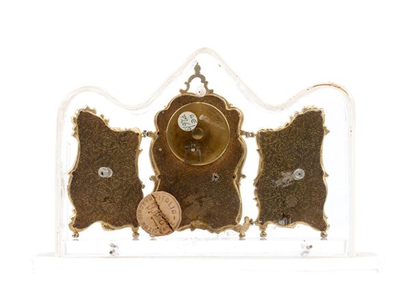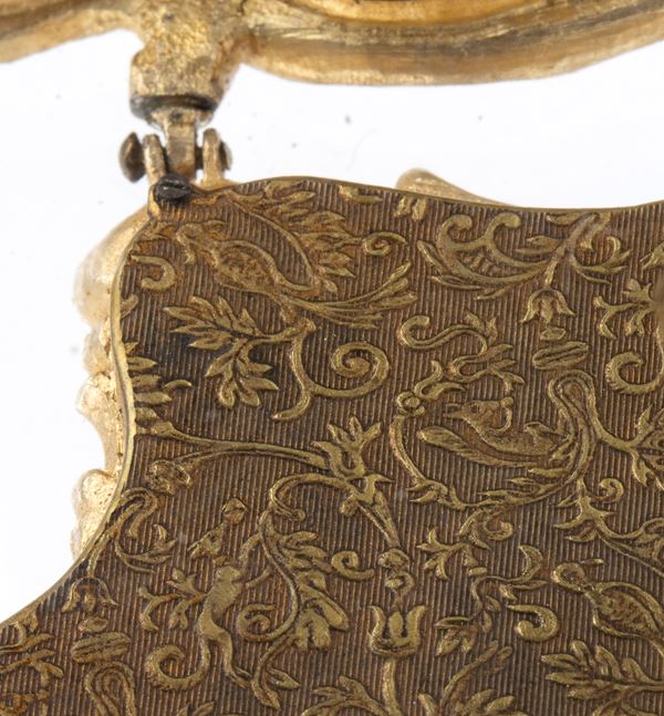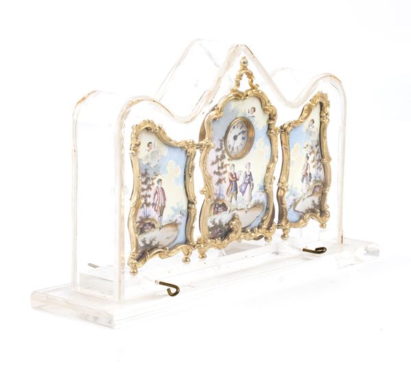 A forma di paravento in bronzo dorato e smalti policromi raffiguranti una scena galante nel pannello centrale e personaggi in riva ad un fiume nella laterali. Nella parte superiore del pannello centrale un orologio con quadrante in smalto bianco, numeri romani e sfere blu.