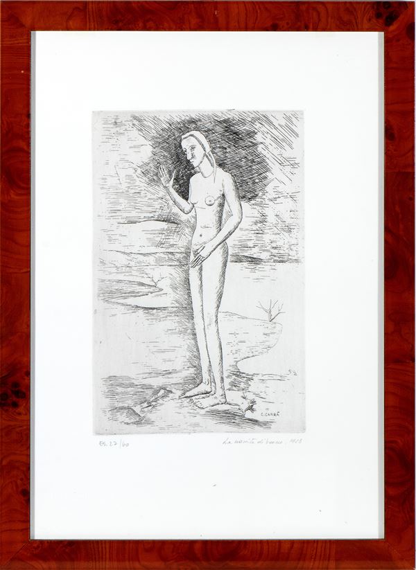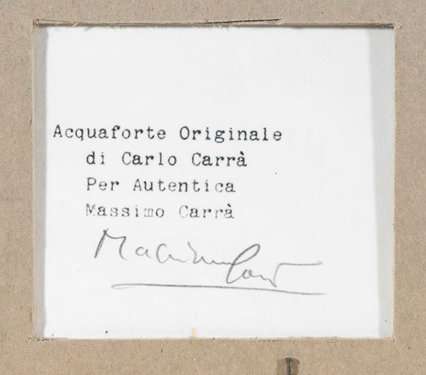 Firma incisa sulla lastra in basso a destra: C. Carrà; titolo, anno e tiratura a matita: La Nascita di Venere, 1923 27/60. Timbro dello Studio Carrà, Milano in basso a destra. Al retro dichiarazione di autenticità di Massimo Carrà