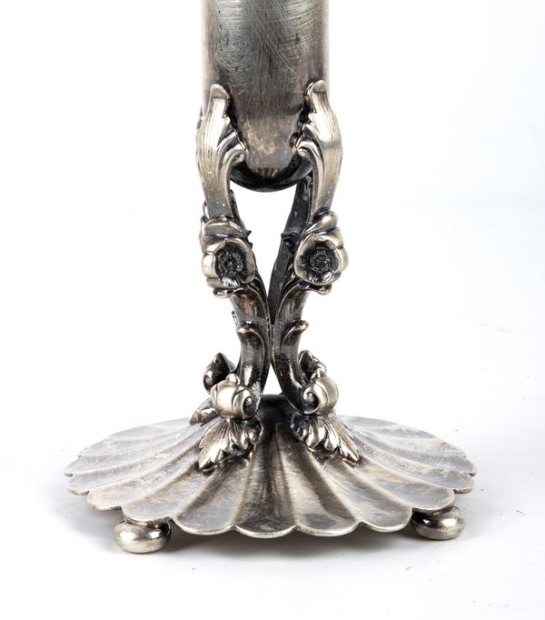 in argento a motivi floreali, con fusto liscio e base di forma circolare a forma di fiore, poggiante su quattro piedini tondi.