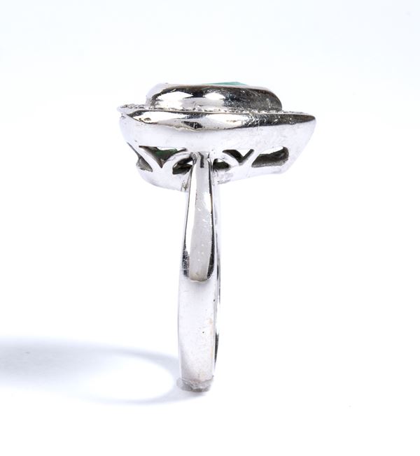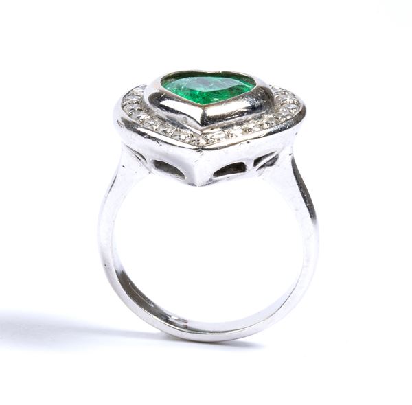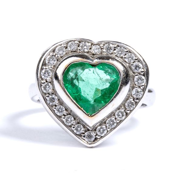 in oro bianco 18k, incastonato con smeraldo a forma di cuore incorniciato da diamanti rotondi taglio brillante.