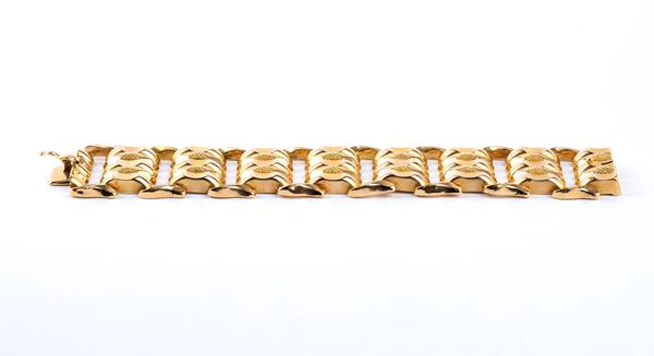 bracciale tank a fascia larga a  in oro giallo 18k, con cinque file di maglie rettangolari articolate e lobate.