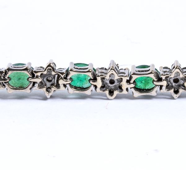 in oro bianco 18k, incastonato con linea di smeraldi ovali separati da motivi a fiore in diamanti rotondi taglio brillante.