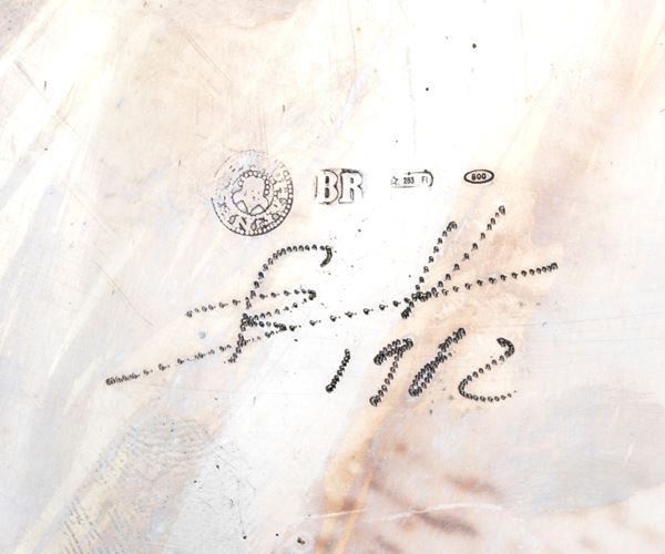 Argento 800/1000, punzonati "BR - 800 - 283 FI", argentoioere BRANDIMARTE, compresa firma autografa di Brandimarte sotto piatti e coppette.