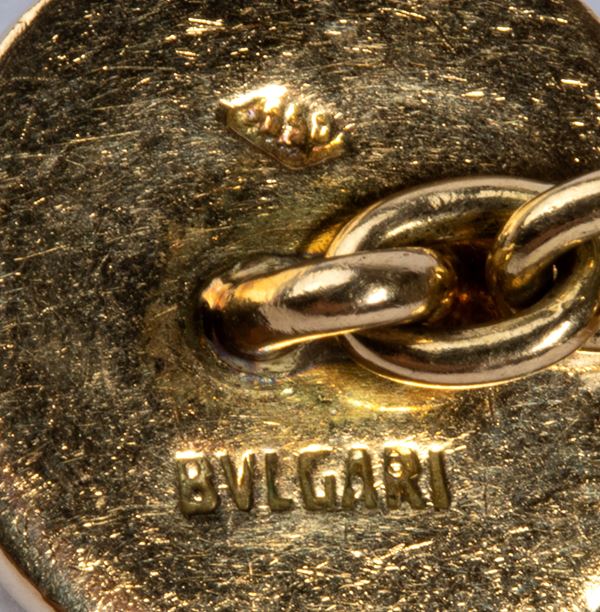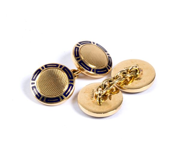 In oro giallo 18k, con decori geometrici in smalti blu.