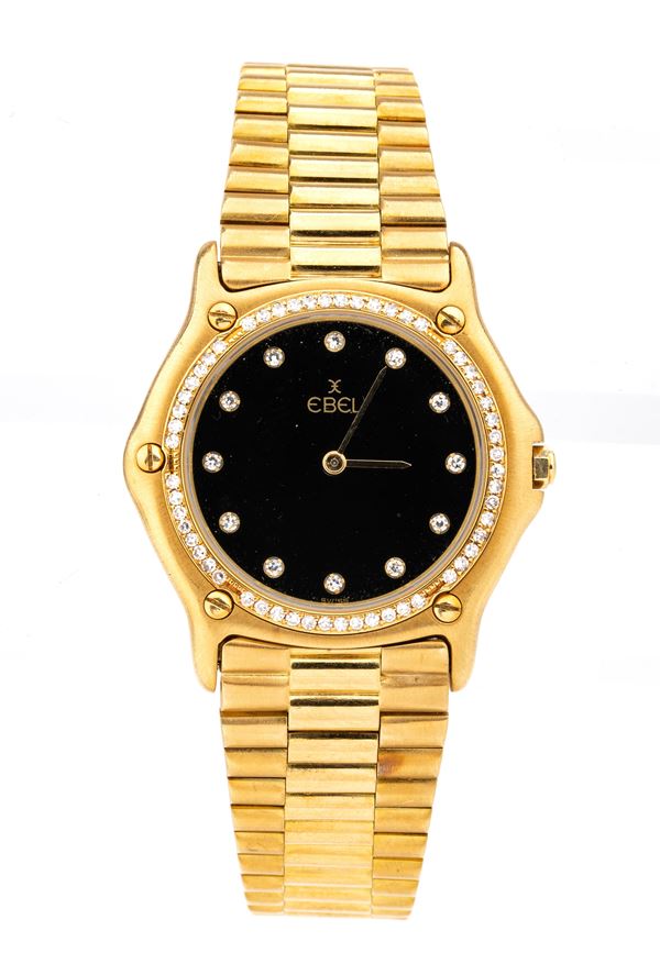 cassa e bracciale in oro giallo 18k con lunetta di diamanti, presenti anche come indici, e quadrante nero. Bracciale con prolunga commerciale in oro. Movimento al quarzo.