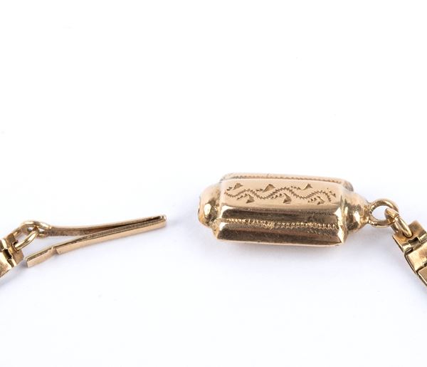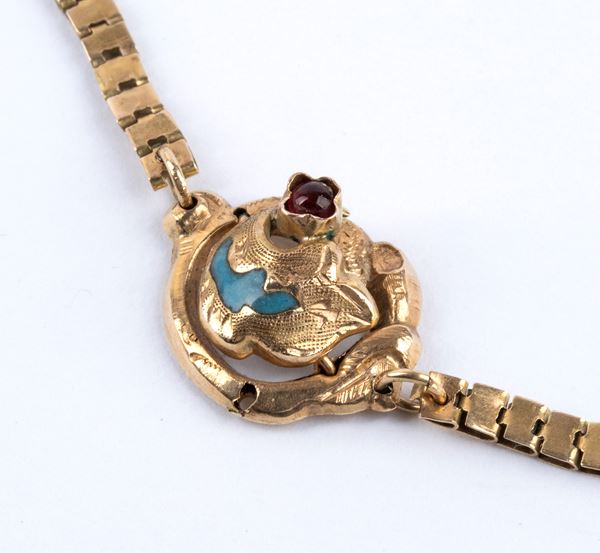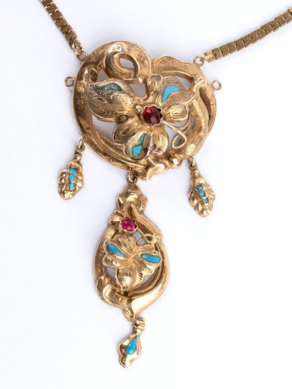catena a maglia tessita in oro a basso titolo, interrotta da decori a motivi floreali con dettagli in smalto azzurro e paste vitree rosse; centrale e pendente modellato ed inciso con le forme tipiche del periodo che danno vita a disegni geometrici e naturalistici, con pendagli che aggiungono movimento al gioiello.