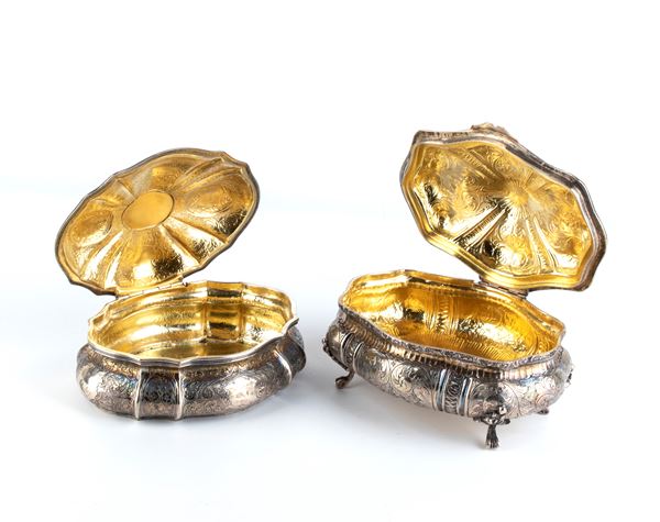 Argento 800/1000, punzonate "800"; una delle scatole presenta il marchio dell'argentiere MIRACOLI ROMEO & C.
