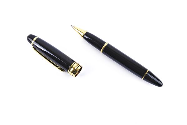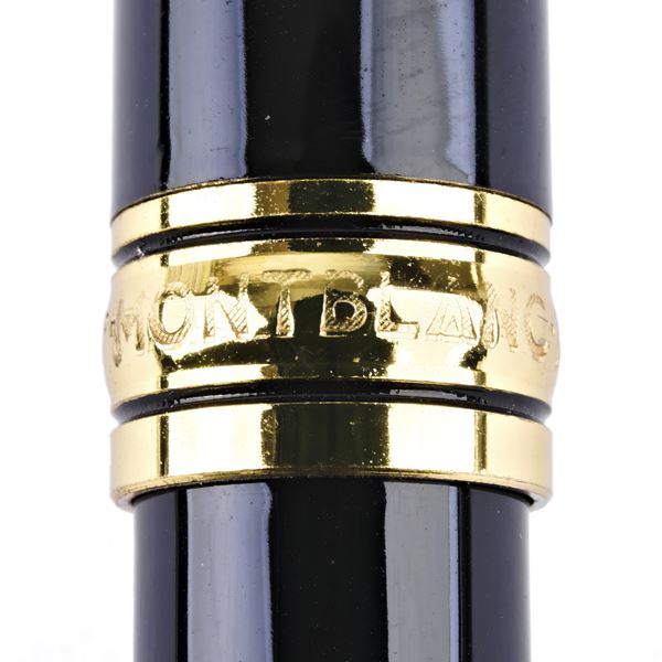 corpo in pregiata resina nera, stella bianca Montblanc intarsiata, finiture e clip dorate.