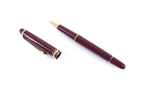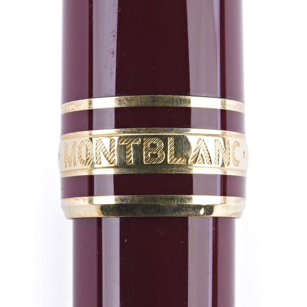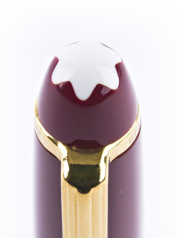 Corpo in pregiata resina rossa, stella bianca Montblanc intarsiata, finiture e clip dorate.