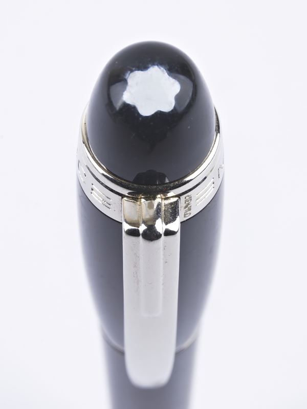 corpo in pregiata resina nera, stella bianca Montblanc fluttuante inserita in una cupola in resina trasparente, finiture e clip in acciaio cromato.