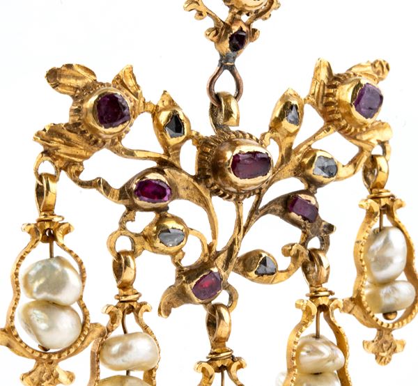 pendente  di origine Siciliana, probabilmente della zona di Palermo, motivi floreali impreziositi da rubini, diamanti e frangia in perle di fiume.