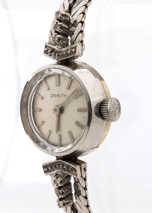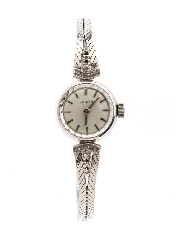 cassa e bracciale in oro bianco con sei piccoli diamanti taglio huit huit, movimento meccanico a carica manuale.