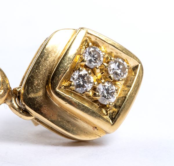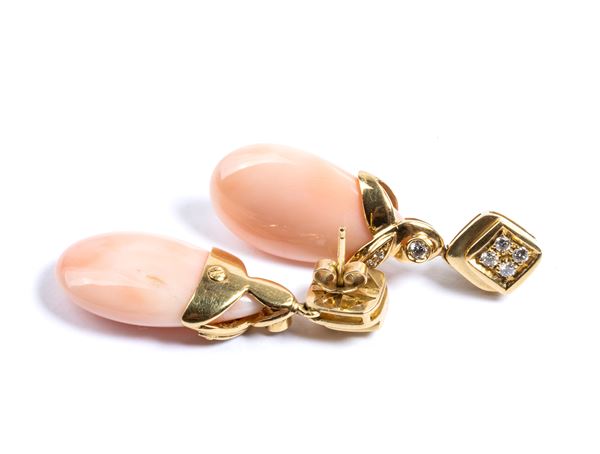 in oro giallo 18k, ciascuno con goccia di corallo cerasuolo (corallium elatius) sormontata da diamanti taglio brillante.