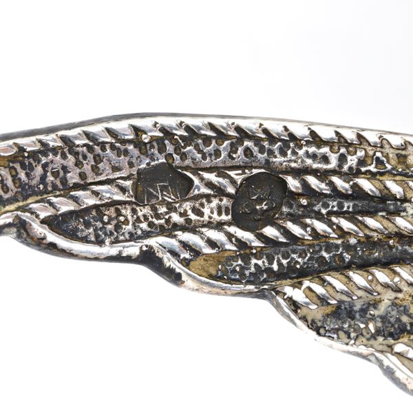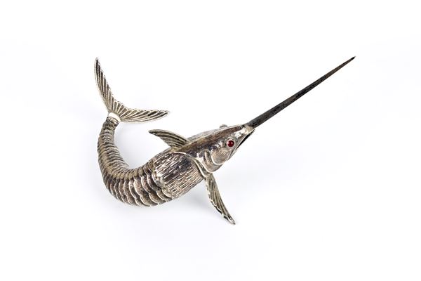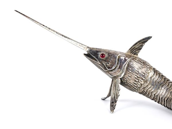 con corpo snodabile raffinatamente decorato da scaglie incise e poggiante sulle pinne anteriori e posteriori, occhi in vetro rosso.