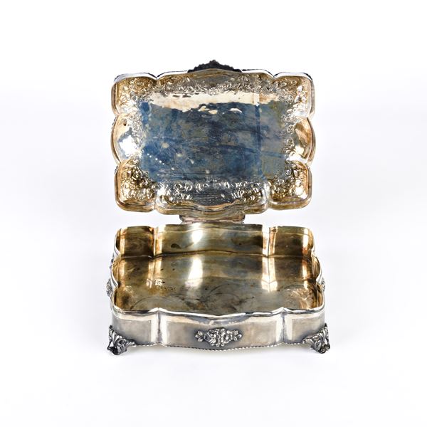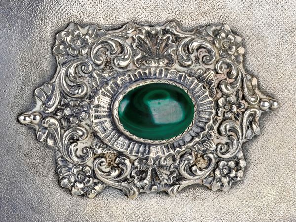 di forma rettangolare, riccamente decorata con motivi floreale e vegetali e incastonata sul coperchio con un cabochon di malachite.