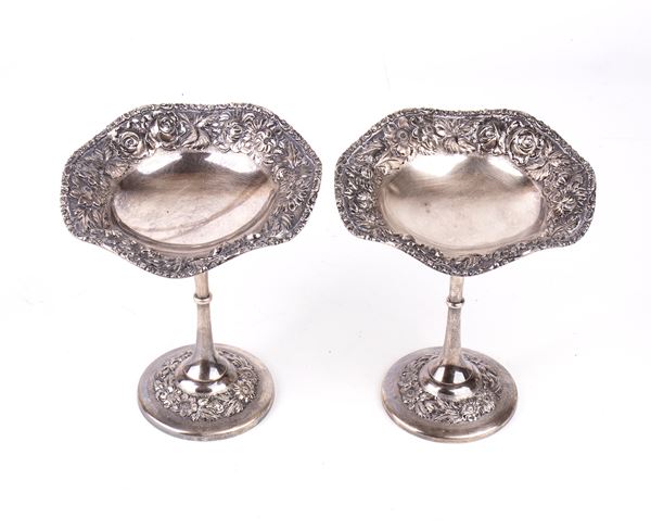 decorate con il motivo “Rose”, spesso indicato come “Baltimore Rose”, e motivi ondulati. Il fusto è liscio e poggiano su due piedi di forma circolare decorati sempre con motivi floreali. Le due alzate provengono dall'azienda Stieff fondata nel 1892 a Baltimora, nel Maryland, e recano il marchio Stieff e la scritta sterling.