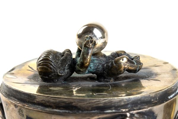 in argento fuso con coperchio ad innesto, decorato teste di femminili, poggiante su tre piedi a zoccolo animale.