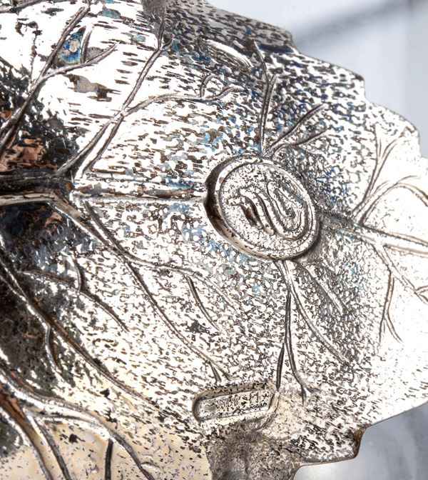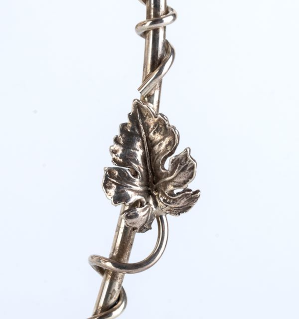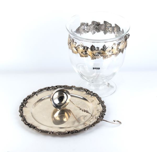composto da un vaso in vetro di forma piriforme, poggiante su base di forma circolare, decorato con foglie di edera in argento che lo circondano; un mestolo in argento decorato con foglie rampicanti sul manico e un vassoio di forma circolare in argento con bordi decorati a foglie.