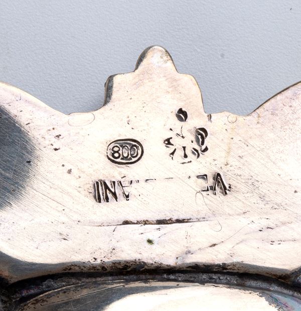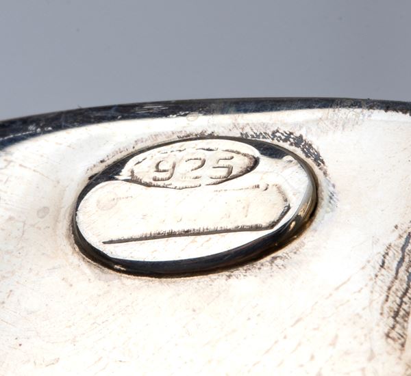 Argento 925/1000 e 800/1000, vaso e cucchiaio punzonati "925"; vassoio punzonato "800".
