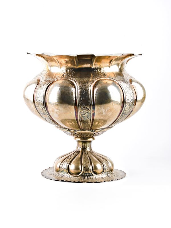 formato da un corpo bombato con bordi sagomati, nodo basso poggiante su un piede circolare, decorato da motivi floreali e baccellature.