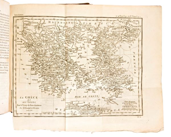 Atlante geografico dell'opera più conosciuta dello scrittore francese Jean-Jacques Barthelemy "Voyage de jeune Anarcharsis en Grece". Terza edizione impressa in Parigi il 1790. Viaggio immaginario nell'antica Grecia con 31 tavole fuori testo raffiguranti mappe, i luoghi più memorabili (Termopili e altro) e i suoi dintorni (Mar Nero e altro), molte delle quali ripiegabili.