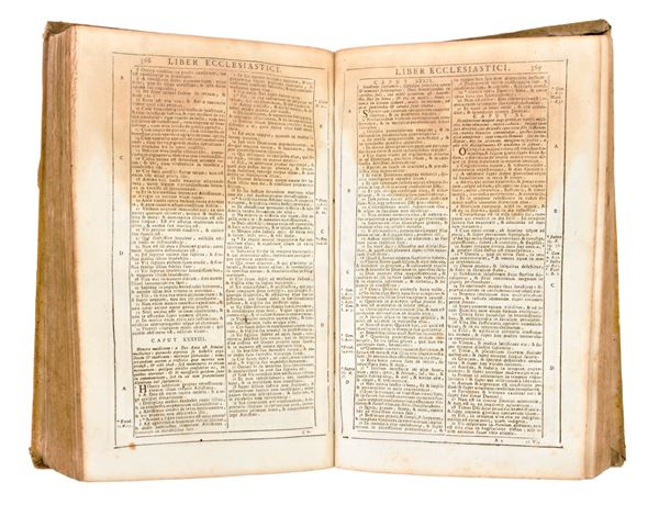 Formato in-8°, mm. 235x140, pp. XX, 738, (2). Completo. Legatura coeva in piena pergamena, difetto al dorso con parte del titolo manoscritto mancante. Antica edizione completa della Sacra Bibbia, impressa in Venezia il 1757 nella tipografia Remondiniana. Antiporta con tavola xilografica, frontespizio stampato in rosso e nero con una vignetta xilografica. Testo latino stampato su due colonne entro cornice. Alcune capilettere e testatine in xilografia nel testo. Presente un indice del volume manoscritto in china antica al risguardo anteriore. Lievi fioriture, e alcune lievi macchie di gora ai margini e nel testo, leggerissimo alone giallo alla parte superiore delle pagine dalla 350 alla pagina 520 circa.