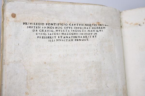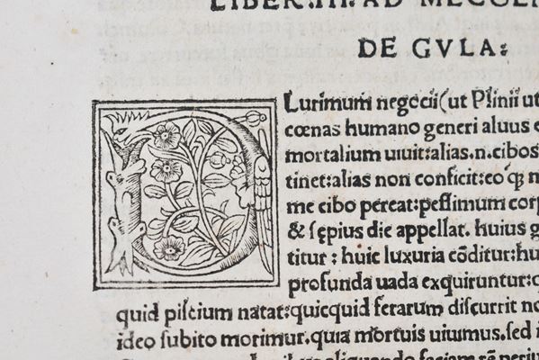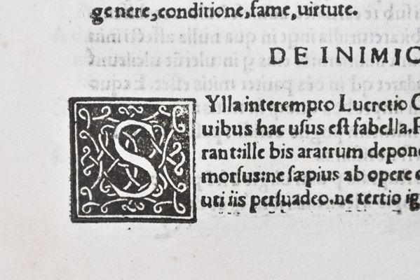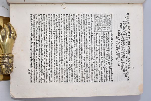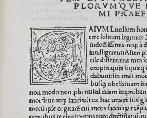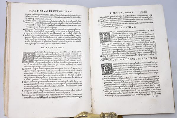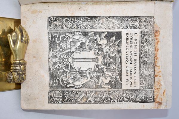 Nuova edizione del Sententiarum liber, rititolata da Brusoni dopo l’edizione originale del 1516; al frontespizio titoli stampati entro cornice xil. con stemma cardinalizio; numerose grandi iniziali finemente incise nel testo. Almeno nelle intenzioni dell’autore e stando a quanto dichiarato dal titolo, l’opera avrebbe voluto proporsi come una ricca raccolta di aneddoti ed exempla morali; al contrario, la lunga sequenza di passaggi caratterizzati da motti di spirito e risposte argute ispirati alle più svariate fonti (Cicerone, Marziale e altri classici) decretarono l’apprezzamento dell’opera da parte del pubblico e il successo commerciale del libro, che fu ripubblicato più volte negli anni seguenti. Dell’autore di quest’opera, un erudito del XVI secolo di origini salernitane, si sa poco o nulla ma pare che fosse vicino all’Accademia Romana, di cui il tipografo Mazzocchi qui coinvolto era libraio. Frontespizio con restauro e ossidazioni al margine sup., piccoli lavori di tarlo alle carte iniziali e finali con minuscole perdite di testo; al verso della prima carta di guardia, una lunga nota manoscritta in china.