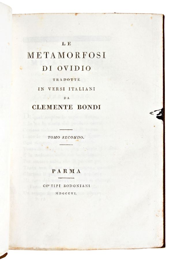 2 volumi In-4°, mm. 170x115, pp. XIV, (2), 399, (5) / (4), 341, (3). Rilegatura post. (XX sec.) in piena pelle con 5 nervature e titoli in oro al dorso. Celebre opera del poeta romano antico Publio Ovidio Nasone (43 a.C. - 17-18 a.C.). Tradotta interamente in italiano dal poeta e traduttore Clemente Bondi (1742-1821). Bondi fu apprezzato soprattutto per le sue traduzioni di testi classici: l'Eneide, le Georgiche e le Bucoliche di Virgilio, Le metamorfosi di Ovidio. La sua opera fu apprezzata anche per le ricche note didascaliche che accompagnavano le sue traduzioni, tanto da farlo soprannominare il Delille d'Italia. Religioso gesuita, fu con Giambattista Bodoni uno degli uomini di lettere che collaborarono alla stamperia ducale di Parma.