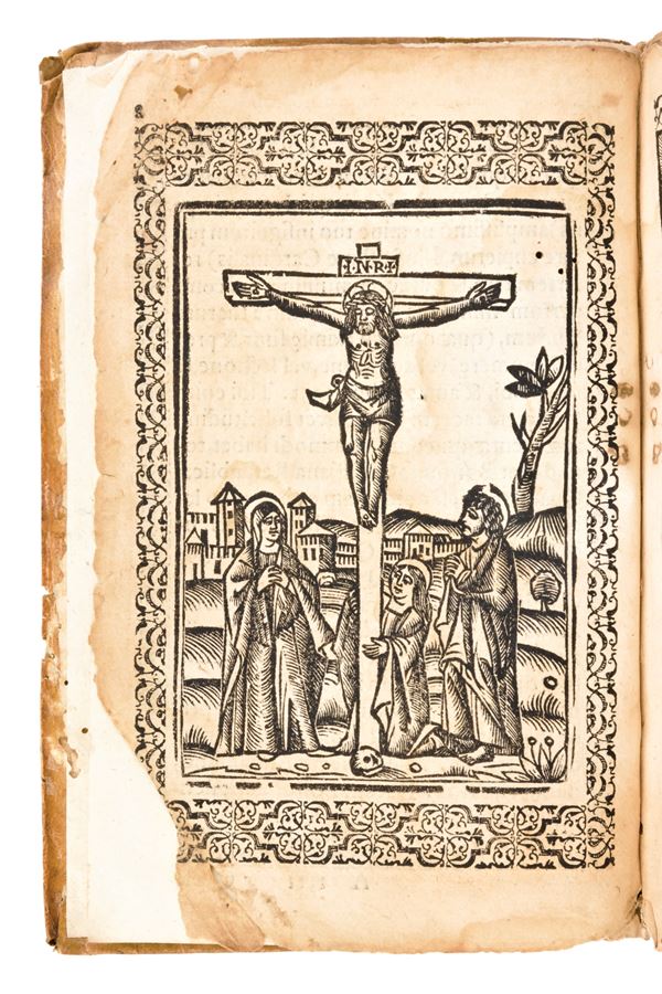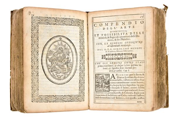 2 opere rilegate in un unico volume, dell'esorcista italiano Girolamo Menghi (1529-1609). In-8°, mm. 165x110, pp. 251, (21), 320, (10). Rilegatura coeva in piena pergamena. Prima opera mancante delle carte A1 (Frontespizio) e A2. Piccola perdita di testo alla c. A3. Macchie e sporadiche fioriture. Antiche note manoscritte nel testo. Lavoro di tarlo ai risguardi. Mancanza della pergamena al piatto posteriore e parte del dorso. Testo entro cornice, capilettere e testatine xilografici.