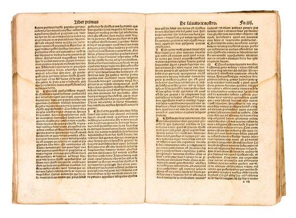 In-8°, mm. 180x130, carte (20), XCVI. (segn. A-B⁸ C⁴ a-m⁸). Completo. Rilegatura coeva in piena pergamena, con difetti e segni del tempo. Lieve gora nel testo in alcune carte. Piccoli restauri ai margini delle prime 3 carte. Frontespizio stampato in nero e rosso entro cornice in xilografia. Marca tipografica in xilografia all’ultima carta. Testo latino. Numerosi capilettera xilografici.