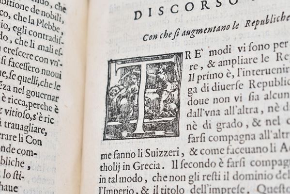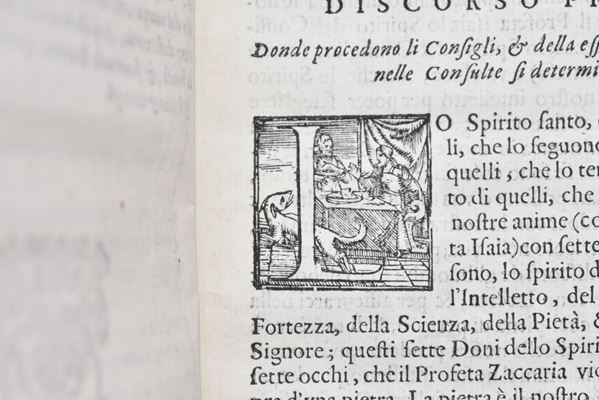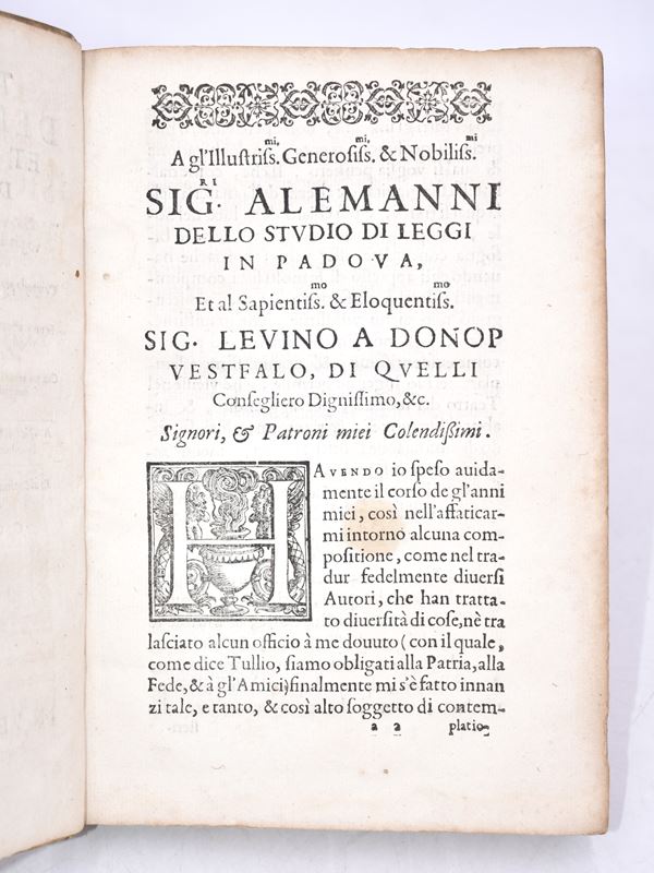 Edizione originale impressa a Venezia, con grandi iniziali finemente incise nel testo, una marca tip. al frontespizio: Colomba con ramoscello di olivo nel becco, in cornice figurata.