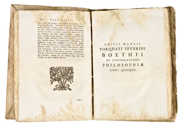 Formato in-8°, mm. 185x130, pp. Lxiv, 143. Cartonato coevo. Note e sottolineature in china antica ai margini del testo. Marca tipografica al colophon, vignetta xilografica al frontespizio. Testo latino con capilettera, testatine e finalini. Frontespizio parzialmente distaccato, con difetti. Lieve macchia di gora al margine superiore delle prime 8 carte. In fine un indice manoscritto in china antica su 8 carte. La consolazione della filosofia è un trattato di Severino Boezio sulla fortuna, la morte e altre questioni, che divenne una delle opere più popolari e influenti del Medioevo.