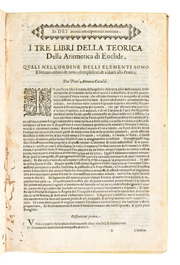 [Matematica] Cataldi, Pietro Antonio : I tre libri settimo, ottavo, & nono de gli Elementi aritmetici d'Euclide ridotti alla pratica... Dove si mostrano le inventioni di molte regole aritmetiche, & altre necessarie, & di continuo uso... In Bologna, per Sebastiano Bonomi, 1621