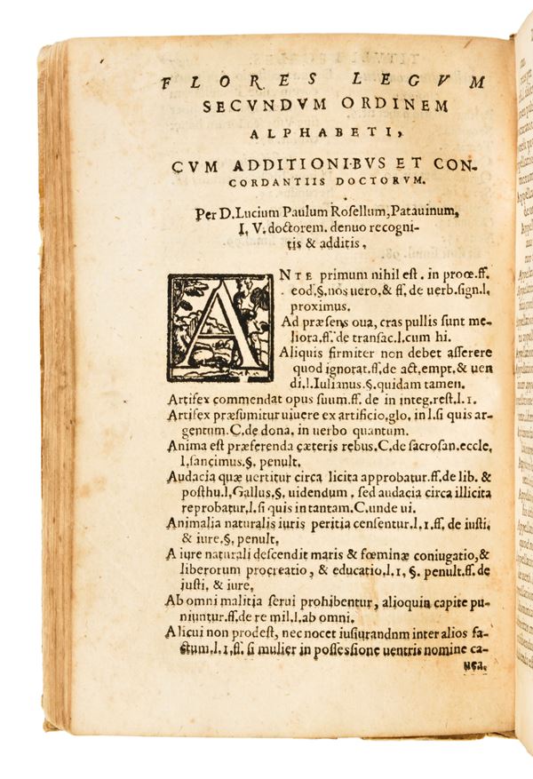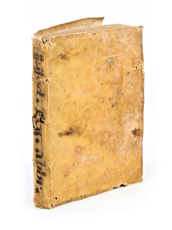 In-8°, mm. 155x105, pp. 284, (4). Manca l’ultima c. bianca S8 e carta di guardia posteriore. Rilegatura coeva in piena pergamena floscia con titoli mansocritti al dorso. Grande marca tipografica al frontespizio e alla penultima carta. Lievi segni di gora e fioritura alle carte. Testo latino. Rari segni in china antica nel testo. Presenti 2 antiche firme manoscritte nel testo alla c. S6.