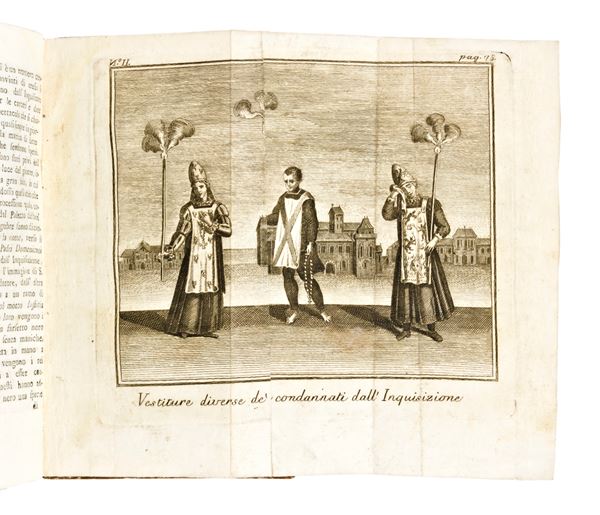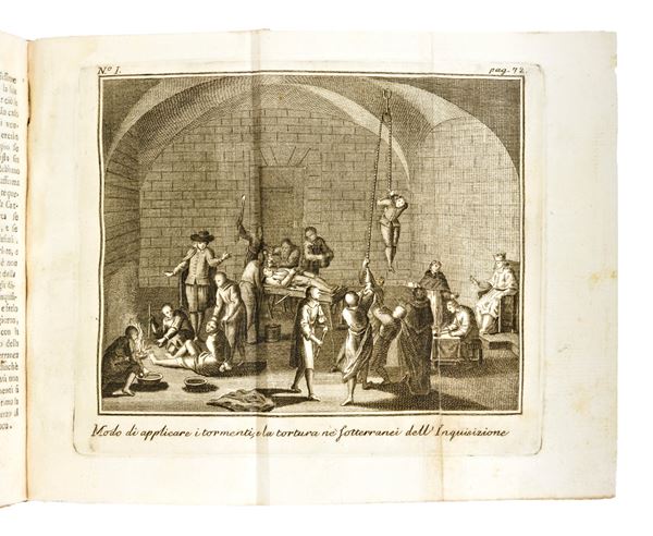 In-12, mm. pp. (2), 259, 2 cc. di tav. ripieg. calcogr. Completo. Cartonato coevo. Lieve gora al margine del testo. Buon esemplare con minimi segni del tempo. Opera di Modesto Rastrelli (cfr. Melzi, I, p. 397). Tavola a pag. 72 raffiguranti le torture dell'inquisizione e la tav. a pag. 78 le vestiture dei condannati.