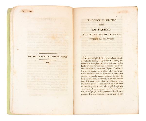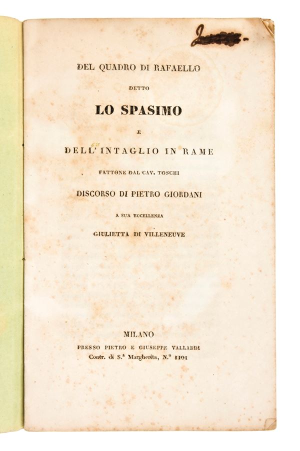 Insieme con opuscolo, titoli : del quadro di Rafaello detto lo Spasimo e dell'intaglio in rame fatto dal cav. Toschi. Discorso di Pietro Giordani a sue eccellenza Giulietta di Villenueve. Milano, presso Pietro e Giuseppe Vallardi, 1833. (pp. 28).