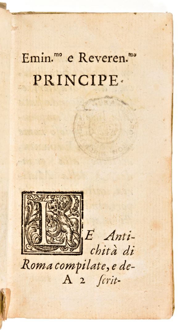 L'antichita di Roma con le cose piu memorabili che in essa di presente antiche , e moderne si trovano, aggiuntevi le spiegazioni di bassi rilievi, & iscrizioni con la notizia delle chiese, palazzi, giardini, e statue che l'adornano, con le funzioni solite farsi dal pontefice. ... Opera divisa in due tomi. In Roma, per Antonio de Rossi : si vendono dal sudetto Gaetano Capranica all'insegna dell'Ercole alla Catena della Sapienza, 1703. Opera di Giacomo Pinarolo Milanese, edizione accresciuta, ristampata da Gaetano Capranica, dedicata al Cardinale Francesco Nerli. Testo in italiano. Solo Tomo primo, con la genealogia di Romolo e il Trattato delle cose memorabili di Roma.