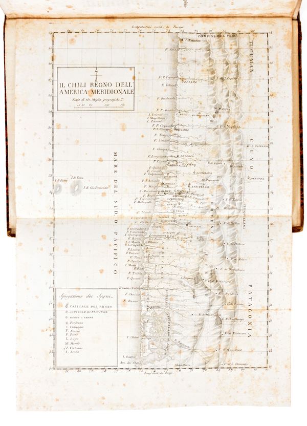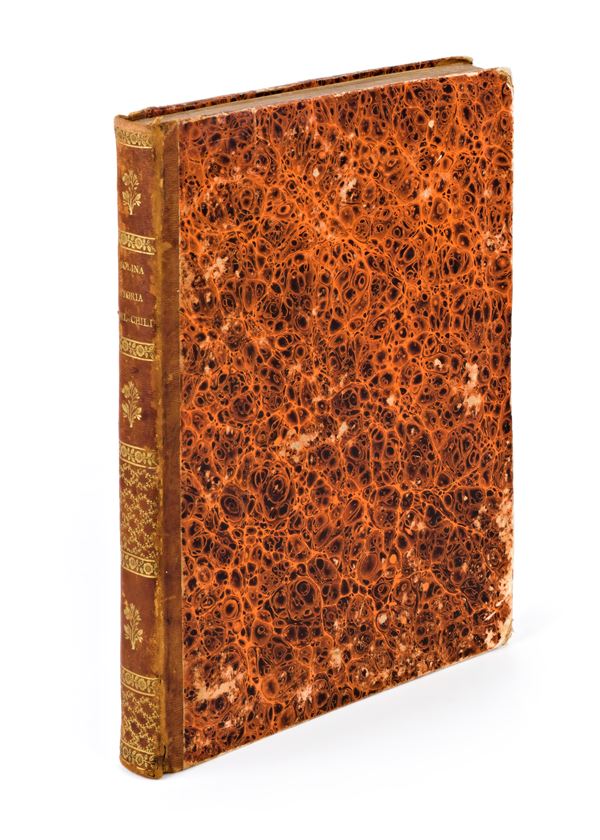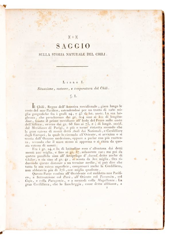 Formato in-4°, mm. 305x225, pp. (6), V, (1), 306, (2). Con 1 ritratto calcografico dell'autore all'antiporta inciso da Francesco Rosaspina su disegno di Giovanni Battista Frulli. In fine una mappa ripiegabile del Cile, con lievi fioriture. Rilegatura coeva in mezza pelle con titoli e fregi in oro al dorso, piatti in carta marmorizzata. Con lievi fioriture alle carte e lieve spellatura al dorso.
