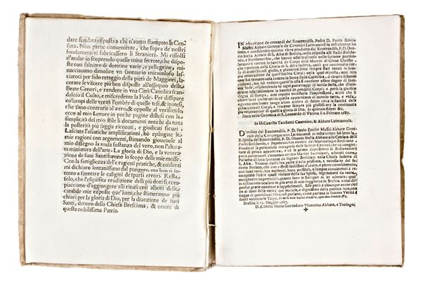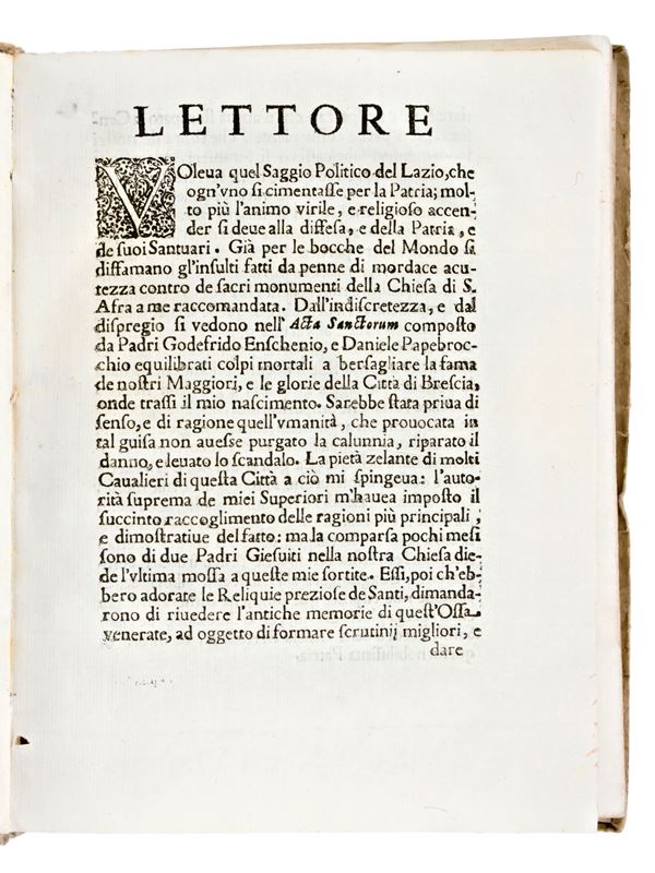 Titolo : Risposta alla censura de padri Godefrido Enschenio, e Daniele Papebrocchio sopra il martirologio bresciano accresciuto con li nomi de santi martiri venerati nella chiesa di S. Afra di Brescia di Onorio Stella abbate della medesima chiesa. Impresso in Brescia il 1687. Cartonato coevo muto. Legatura allentata. Fregio xilografico al frontespizio. Testatine, capilettera e finalini xilografici. Testo nitido. In-4°, mm. 245x180, Pp. (16), 195.