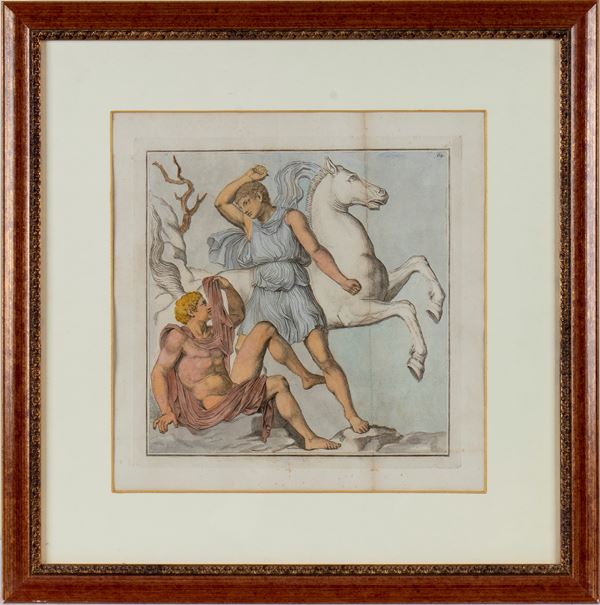 Bulino e acquaforte, 350 x 340 mm (foglio). Con coloritura coeva e bella cornice (53,5 x 53,5 x 2 cm). Tratta dalla serie di incisione pubblicate in vista di illustrare "Monumenti antichi inediti spiegati ed illustrati da Giovanni Winckelmann..."