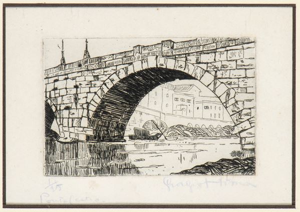 1) "Ponte Cestio a Roma", 74 x 112 mm, tiratura 1/25, firmata e titolata a matita. Con cornice (28 x 33 x 3 cm).