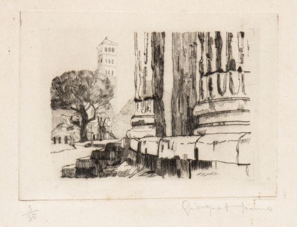 2) "S. Maria in Cosmedin vista da dal Tempio di Ercole Vincitore", 123 x 167 mm (lastra), 245 x 305 mm (foglio)m  tiratura 3/35, firmata a matita.  Con cornice (30 x 37 x 3 cm).