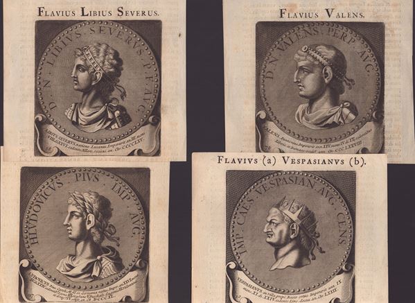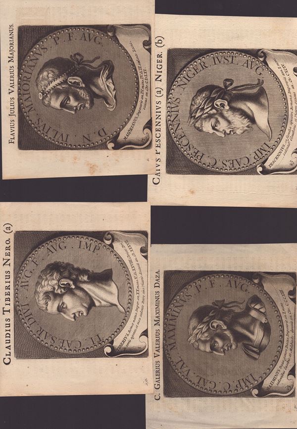 Tratte da "De Roomsche Monarchy" di Abraham Bogaert, raffiguranti le monete della collezione romana di Cristina di Svezia. Bulino, 155 x 185 mm ca.