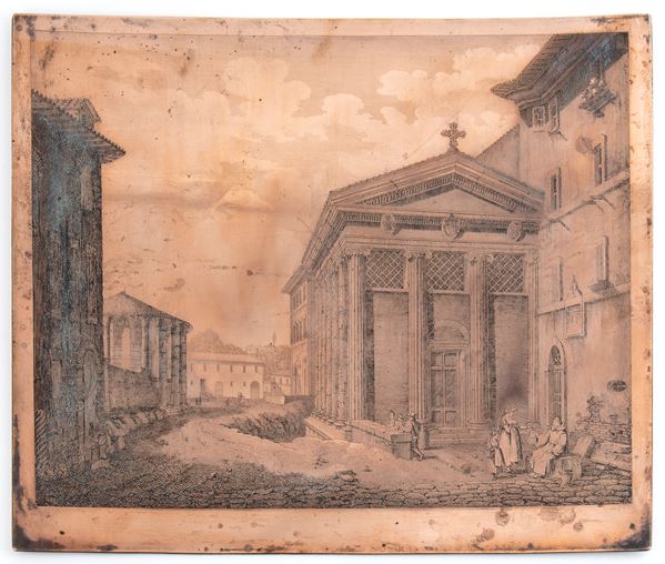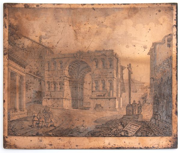 tre lastre in rame, 30 x 36 cm ca. cad., raffiguranti Foro Boario, Arco di Giano (datata 1821) e la Basilica di Massenzio. In buono stato generale