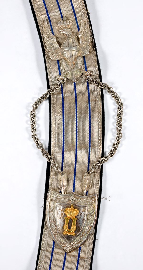 Bandoliera in tessuto operato argento con filettature azzurro, senza rinforzo in cartone interno, applicazioni in argento con scudo con monogramma reale sotto corona, "U"; in buono stato, in patina.