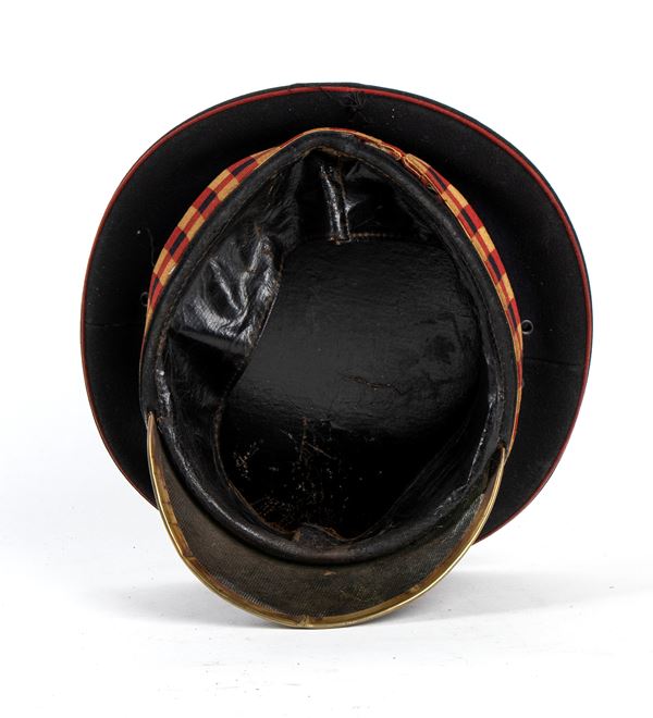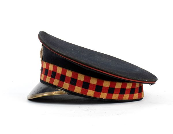 Berretto tradizionale del Reggimento Guardie Scozzesi, in panno blu scuro profilato rosso e tamburo in tartan, visiera bordata di ottone interno di tela cerata nera. Marcato all'interno dell'alluda con freccia e datato 1917. In ottimo stato.