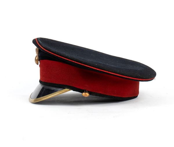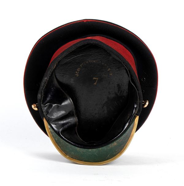 Berretto in panno di lana blu scuro profilato rosso con fregio specifico in ottone, interno di tela cerata nera con timbri di accettazione e data indecifrabile. Senza soggolo, altrimenti in ottimo stato.