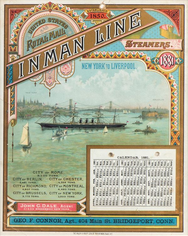 Calendario per l'anno 1881 della INMAN LINE - UNITED STATES ROYAL MAIL - New York to Liverpool - Su cartoncino rigido, cromolitografia - Stampato The Major & Knapp Lith Co. - N.Y. Misure circa cm. 22x27 - Originale , in ottime condizioni