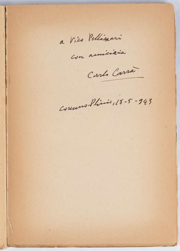 Dedica e firma autografe di Carlo Carrà sul volume "Artisti moderni - con una lettera di Massimo Bontempelli", scritti ad inchiostro nero, indirizzata al Vico Pellizzari senatore del Regno, 1943