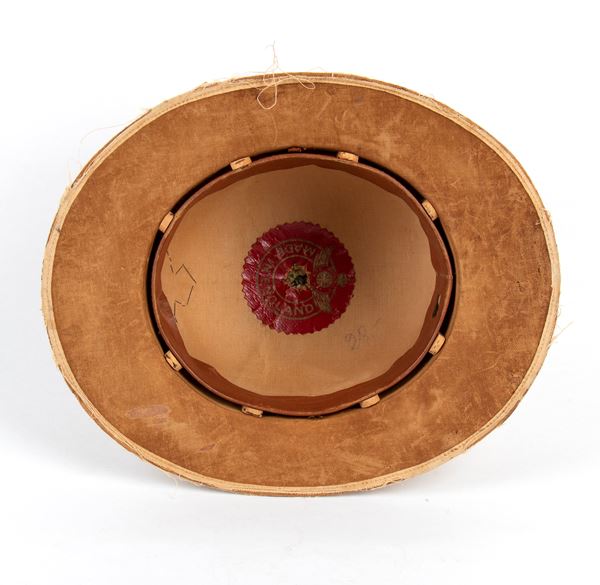 Casco in feltro pressato o sughero ricoperto di tela di cotone bianco, bel fregio frontale di canottiglia dorata su fondo blu scuro. Difetti al bordo ma bello; buono stato.